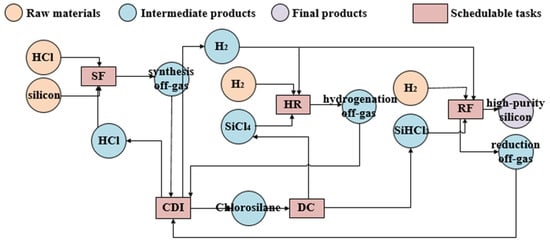 Through the analysis of the sequential requirements of the polysilicon production process mentioned above, an STN model of polysilicon production, as shown in Figure 3, can be derived. The STN model contains two types of nodes: state and task nodes. The state nodes have two attributes: the initial amount of material and the maximum storage capacity of that material; task nodes have six attributes: the minimum input, maximum input, minimum output, maximum output, production equipment, and operating power.