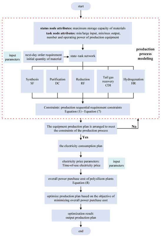 The purpose of the proposed scheduling model, which accounts for timing requirement constraints under time-of-use electricity pricing, is to adjust the production schedule of the polysilicon plant from a day-ahead perspective to minimize electricity costs while ensuring that the normal production of the enterprise is not affected. The procedure of the model is shown in Figure 4.