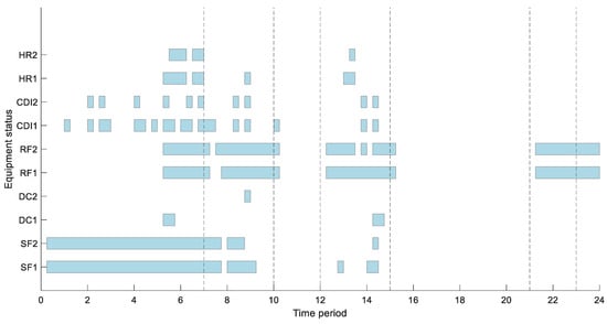 Based on the above data, a simulation analysis was conducted, resulting in a daily production schedule for the polysilicon plant, as shown in Figure 5; the corresponding power usage is shown in Figure 6. It can be observed that production is mainly concentrated to within valley periods, but due to storage equipment capacity constraints and product order requirements, some equipment operates during flat and peak periods.
