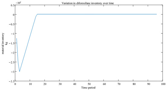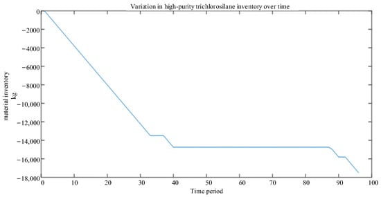 By analyzing the operating status of the equipment and material inventories, the variation in the stock of high-purity trichlorosilane over time is shown in Figure 7. It is evident that high-purity trichlorosilane, used to produce the final product, is only consumed and not produced. This is because, without constraints on amount of material required, the quantities of silane liquid, high-purity trichlorosilane, and high-purity silicon tetrachloride can be less than zero. As a result, production quantity constraints can be met without executing upstream tasks, and only the reduction task needs to be activated to produce sufficient high-purity silicon. However, this does not align with actual production requirements. Therefore, the production process constraints proposed in this paper are necessary to describe the relationships between production tasks, ensuring a safe and feasible production plan for this polysilicon plant.