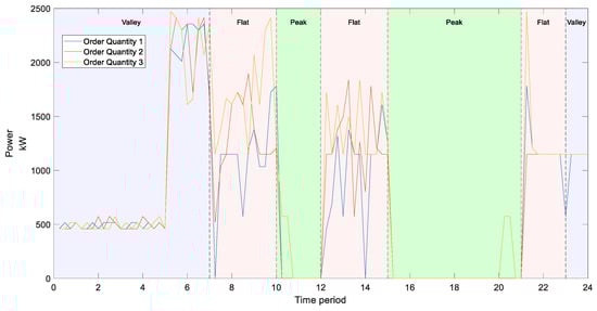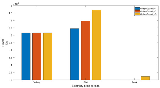 Under these three order quantity constraints, the production schedule of the plant is optimized, and the comparison of its electricity costs is shown in Table 6, while the comparison of its power usage over the entire day is shown in Figure 10, and the comparison of its power usage across different electricity price periods is shown in Figure 11.