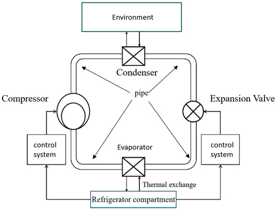 The principle and process of the refrigeration system are constituted by the refrigeration circuit depicted in Figure 2. The refrigeration system operates through a circuit that involves heat exchange, centered around four key components: the compressor, condenser, expansion valve, and evaporator, connected by piping. The process begins with the refrigerant being compressed by the compressor into a high-pressure gas, heating up in the process. This gas then cools and liquifies in the condenser by releasing heat to the external air. The expansion valve reduces the refrigerant’s pressure and temperature, turning it into a low-pressure liquid. Finally, in the evaporator, the refrigerant absorbs heat from the storage chamber’s air, returning to its gaseous state and cooling the air inside. This cycle repeats to maintain cooling [7,8,9].