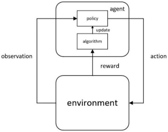 Reinforcement learning is a machine learning approach that develops behaviors via trial and error in dynamic settings. As shown in Figure 3, it involves two primary entities: the agent, or the learner, and the environment, the subject of learning. The agent operates based on a policy, which guides action selection in response to environmental states, and a learning algorithm, which adjusts the policy based on actions taken and their outcomes, signaled by rewards. Rewards evaluate the success of actions towards achieving a goal, influencing the learning algorithm to refine the agent’s policy for optimal action selection. The process comprises steps that continue until specific conditions are met, marking an episode’s end. Through repeated episodes, the objective is to forge a policy that maximizes cumulative rewards, enhancing the agent’s performance in the environment [10,11,12,13].
