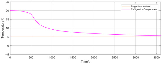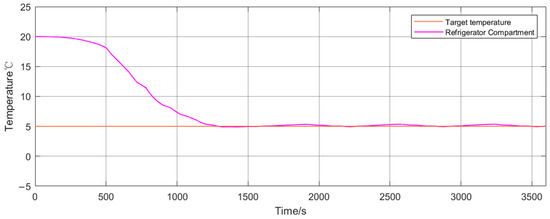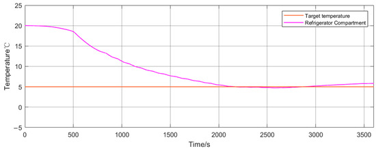 Figure 5 and Figure 6 represent the simulation results of the refrigeration system model under a constant learning rate. The orange line represents the design target temperature of the refrigeration system, which is 5 °C, and the pink line shows the temperature data within a 3600 s span of the model. The training was completed after approximately 14 h and 30 min.