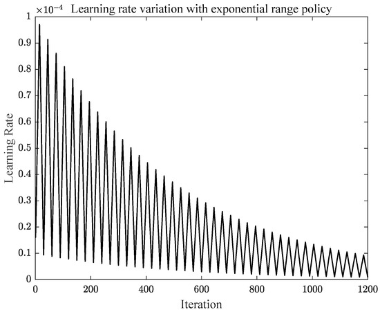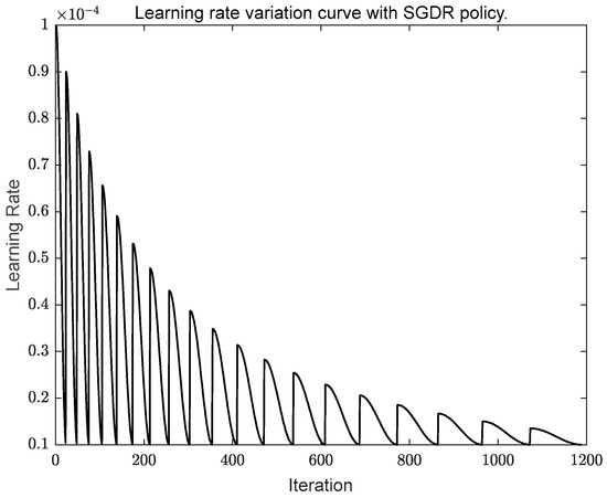 Equation (8) describes the learning rate for the SGDR (Stochastic Gradient Descent with Warm Restarts) method. The learning rate starts at and decreases following a half cosine wave down to as progresses from 0 to . This cyclical pattern allows the learning rate to reset periodically, giving the algorithm a chance to escape from local minima and helping to find better global minima by exploring different parts of the loss landscape more effectively [23,24,25,26].