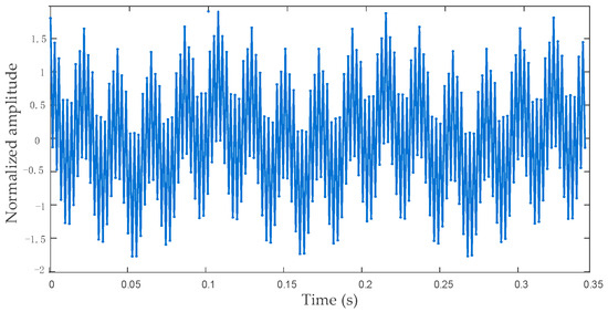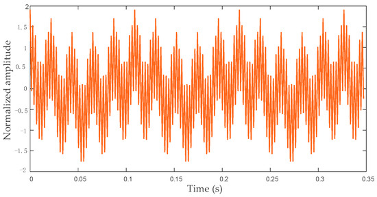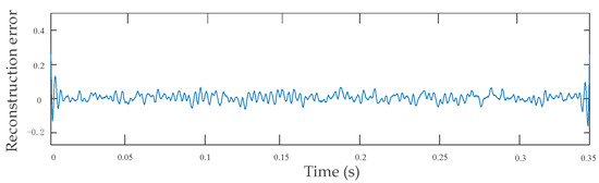 Constructed by 10 Hz, 50 Hz, 200 Hz, and 400 Hz superimposed on the wideband oscillation of the original signal—as shown in Figure 2—setting the sampling frequency for HZ, the data segment length , CS compression multiples of (for an original oscillation data segment after CS compression there are only under sampled signals, as shown in Figure 3) significantly improves the efficiency of data transmission. By using the OMP algorithm to reconstruct the compressed 65 data points, as shown in Figure 4, the reconstructed waveform and the original data waveform error is small, as shown in Figure 5; which proves the effectiveness of the proposed method, and also shows that a small number of compressed data points are specific to the key features of the original signal, which can be used directly as the input value of the feature matrix to achieve the localization of the wideband oscillator source in the deep-learning network.