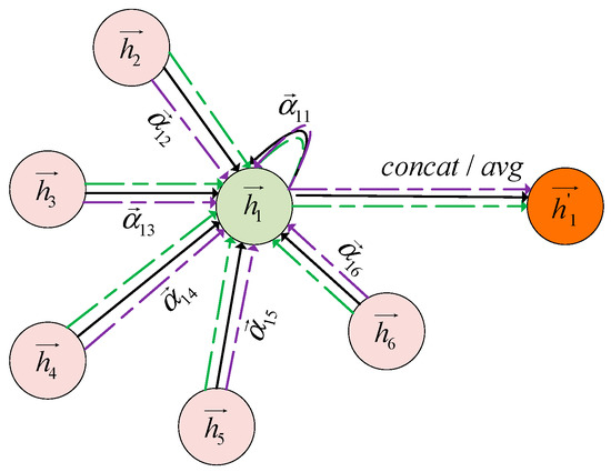 Figure 6 shows the type of multi-head attention aggregation process; this paper samples a three-head attention mechanism, and nodes of each attention coefficient are calculated independently of each other.