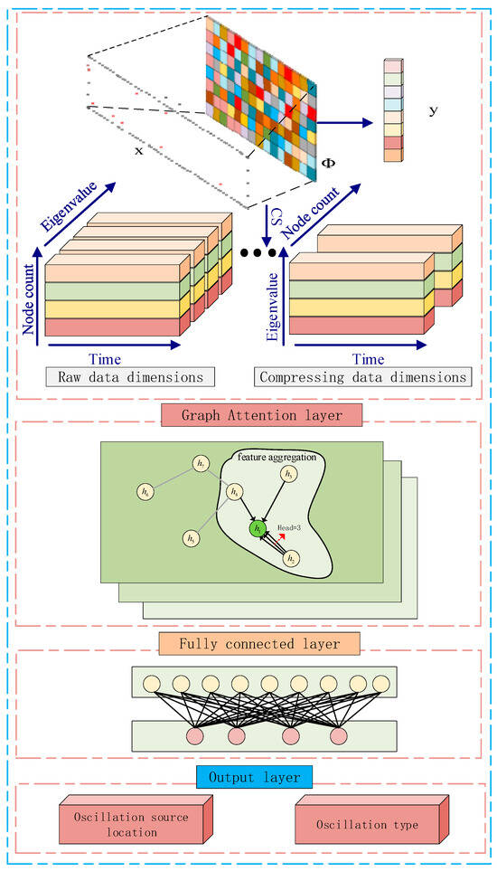 In recent years, the development of artificial intelligence technology and the promotion and application of wide-area measurement system, through the “offline training, online evaluation” way, can quickly complete the node classification, load prediction, oscillation localization and other tasks [15,16,17]. Studies [18,19] have used compressed perception and a graph convolutional neural network to do a preliminary study of the wideband oscillation source localization problem, but did not consider the attention mechanism. Studies in the literature [20,21] have proposed a broadband oscillation wide-area localization method based on self-encoder signal compression and a long short-term memory (LSTM) network, using s self-encoder to compress and decode the information of each sub-station so as to carry out a wide-area monitoring and analysis of broadband oscillation signals. GAT [22,23,24], as a graph deep learning algorithm, is able to learn its own node feature information while weighting the aggregation of neighboring node states based on the grid topology feature matrix, due to its unique graph data reading capability and multi-head attention mechanism. The exploration results show that GAT can accurately identify the source of oscillations by utilizing the real-time data of nodes (e.g., generating stations, substations, and load points) in the power system, and dynamically capturing the complex interactions among the nodes through the attention mechanism. This not only improves the accuracy and speed of oscillation localization, but also provides strong support for real-time monitoring and early warning, which helps O and M personnel to take timely measures to ensure the stable operation of the power system.