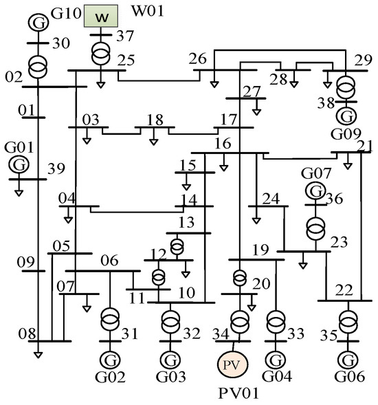 The IEEE-39 buses built with PSASP simulation software are shown in Figure 9. Among them, node 37 is changed to a 300 MW doubly fed wind farm, and node 34 is changed to a 300 MW PV plant. The base power of the system is set to 100 MVA, the rated frequency is 50 Hz, and the generator is modeled by the classical second-order model.