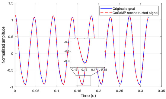 By comparing the waveforms of the CoSaMP algorithm and the OMP algorithm in different frequency bands, it can be clearly seen from Figure 11 that the reconstructed waveforms of the CoSaMP algorithm can be more closely matched to the original signals compared to the OMP algorithm, as shown in Table 1. By comparing the specific reconstruction time and error of the two algorithms, it can be observed that the reconstruction error shows a decreasing trend with the increase in the number of iterations of the CoSaMP algorithm; however, an increase in the number of iterations also leads to an increase in the reconstruction time. The increase in the number of iterations also leads to the prolongation of the reconstruction time. Therefore, in practical applications, it is necessary to find an optimal balance between the reconstruction accuracy and the computational efficiency to meet the requirements of the features.