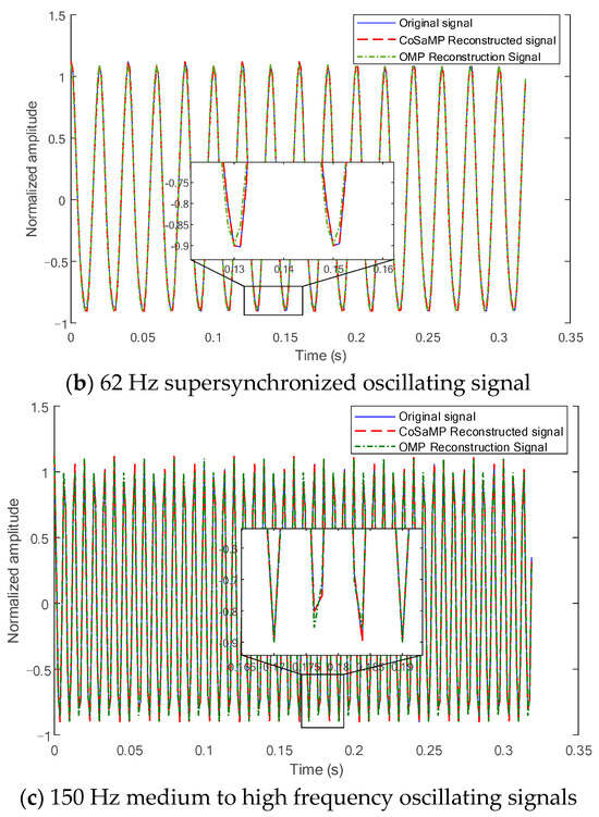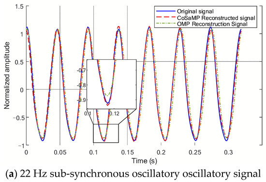 Due to the bandwidth limitation of the power system line transmission network, the main station is unable to comprehensively monitor the broadband oscillation signals, so the CoSaMP algorithm is used to monitor the broadband oscillation frequency bands and upload the low-dimensional compression data. Figure 10 demonstrates that the waveform of the 22 Hz sub-synchronous oscillation with the second and the third harmonics basically fits with the reconstructed waveforms, which indicates that the low-dimensional oscillation signal features extracted by compression perception can represent the original signals.