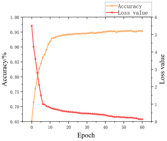 The cross-entropy loss function is invoked before training to eliminate the effect of sample imbalance on the results, and the broadband oscillatory localization model composed of three layers of GAT, one fully connected layer, and a Softmax output layer is used for training; during the training process, the Epoch is set to be 60, the number of samples for each training is 80, the Learning Rate is set to be 0.001, and the Drop Rate is set to be 0.5; the training process is shown in Figure 8, and the formula for the accuracy rate is as follows: