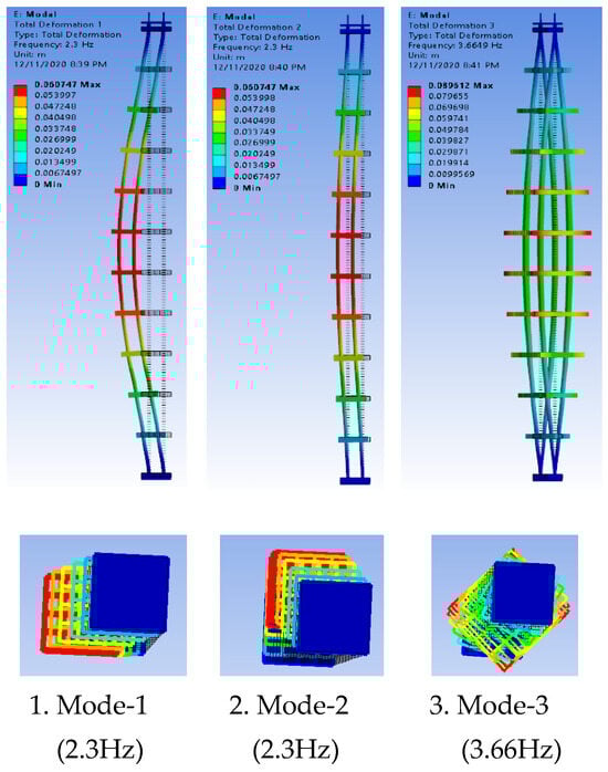 Modal analysis of fuel assembly with the upper image providing a side view and the lower image offering a top-down perspective [1].