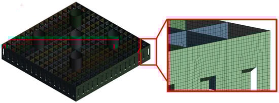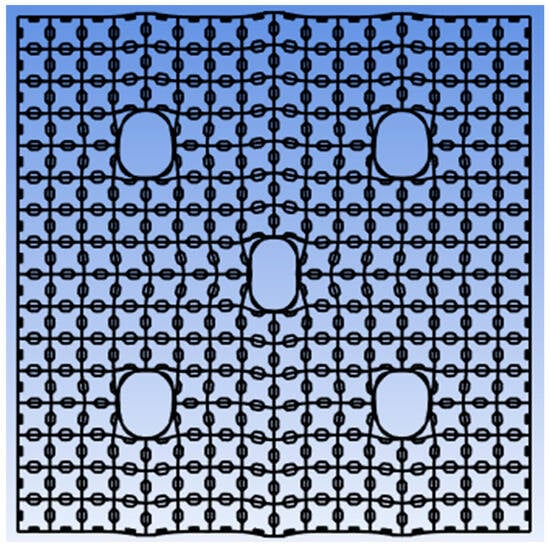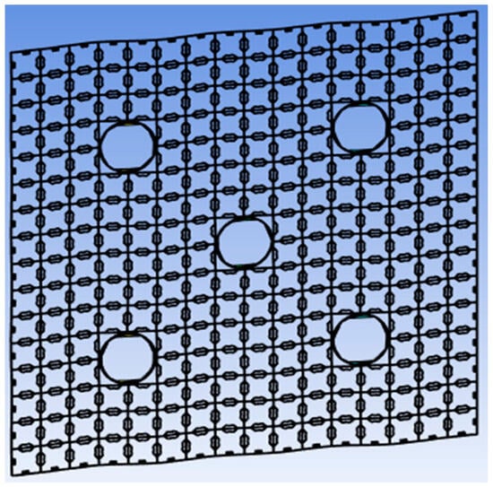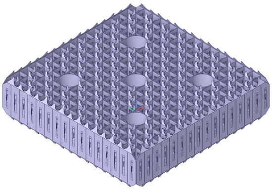 A detailed 3D model of the mid-spacer grid of the PLUS7 nuclear fuel assembly for the APR1400 reactor is presented in Figure 3. The mid-spacer grid model of PLUS7 nuclear fuel assembly was chosen for this study, specifically designed for the APR1400 and OPR1000 reactors. This design represents an enhancement aimed at improving fuel efficiency and overall performance [10]. As explained above, there are five large holes for guide tube installation. From Figure 1, there are nine mid-spacer grids used in a single fuel assembly. Constructing a Finite Element Analysis (FEA) model using a full spacer grid design entails a significant number of elements and nodes, demanding substantial computational resources and time to solve the system equations. A typical coarse mesh will produce an FEA model that can exceed 1 million nodes and half a million elements.
