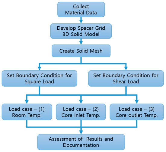 For this research, we used CATIA V5 6R2021 and SpaceClaim R2024, 3D CAD software, to create a surface model of the mid-spacer grid of a PLUS7 fuel assembly. This surface model was used to develop an FEM model in which a shell element is utilized as the base element. The meshed models were subsequently employed to conduct static structural analysis using ANSYS Mechanical. The simplified and meshed models were employed to evaluate the structural response under both normal and shear displacement input across core inlet, core outlet, and room temperatures. The modeling and analysis flow is depicted in Figure 5.