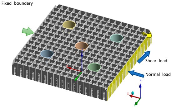 Utilizing a simplified and reduced 3D shell model of the spacer grid, we conducted comprehensive analyses to obtain load–deflection results. These analyses included room temperature and core inlet and outlet temperature conditions. Our study revealed a significant discrepancy in the structural response of the spacer grid. As shown in Figure 10 and Figure 11, the spacer grid demonstrates strong resistance to normal loads but weak resistance to shear loads, with a difference of approximately 440 times. This confirms the heightened vulnerability of the spacer grid to deformation in the shear direction. The reason for this deformation lies in the structural characteristic of the spacer grid, where intersecting plates are welded together, resulting in varying degrees of deformation depending on the direction of the applied load.