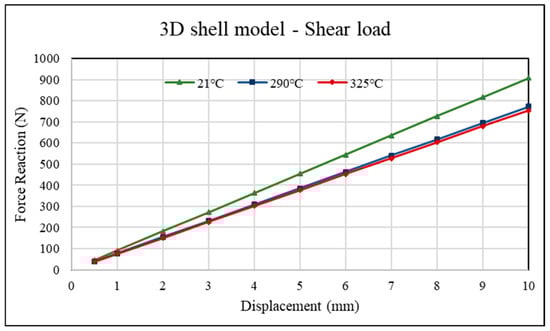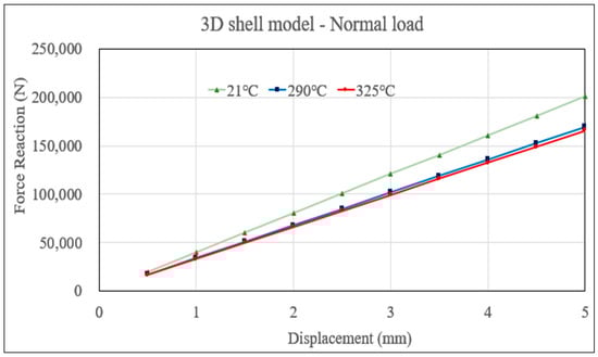 Figure 8 illustrates the result of deformation of the 3D shell model following displacement loads under normal loading conditions, while Figure 9 depicts the corresponding patterns under shear loading conditions. Additionally, the force reactions elicited by normal and shear displacement loads across all temperature scenarios are detailed in Figure 10 and Figure 11, respectively. At 21 °C, the reaction force induced by normal loading is approximately 442 times greater than that induced by shear loading. At 325 °C, this difference is around 438 times, demonstrating the relative weakness of shear loading. While the difference slightly decreases as the temperature rises, it remains significantly large. This indicates that the primary influence of normal loading on the structural strength of the spacer grid is maintained even as the temperature increases. These results suggest that the influence of normal loading should be considered the most critical factor in the design and evaluation of spacer grids.