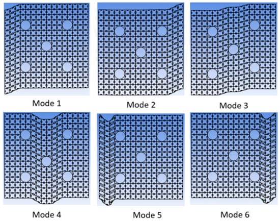 Furthermore, our buckling analyses have yielded insightful results, revealing six distinct buckling loads corresponding to six calculated modes. These findings are visually represented in Figure 12, with further elaboration provided in Table 2, highlighting the specific buckling loads identified. Mode 1, representing fundamental axial buckling, showed a clear decrease in structural strength with rising temperature. The shell model consistently demonstrated a reduction in buckling load as temperature increased, with a decrease of approximately 15–20% between 21 °C and 325 °C. This reflects the degradation of Zircaloy-4’s material properties under high-temperature conditions. Higher modes (Modes 2–6) exhibited increasingly complex deformation patterns, including diagonal and torsional components. This trend emphasizes the importance of considering material property degradation in design evaluations.