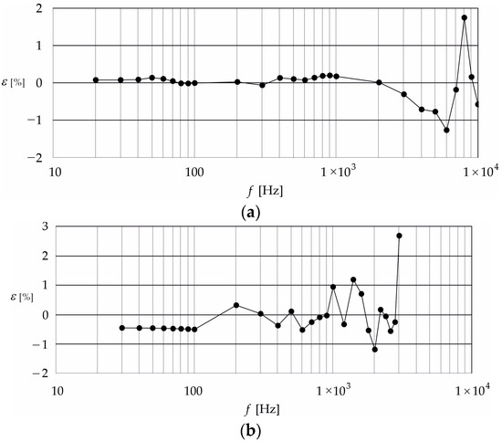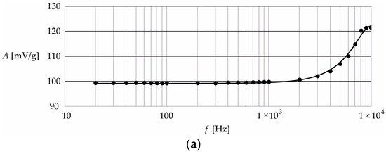 Figure 3 shows the calibration certificates obtained for the PCB 353B34 (Figure 3a) and Althen 731–207 (Figure 3b) accelerometers. Both deviation characteristics are presented on a logarithmic scale here due to the wide range of frequencies considered for the input excitation signal.