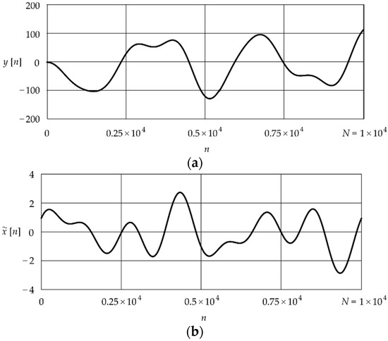Figure 6 shows the input–output signals obtained by applying the deconvolution algorithm given in Equations (18) and (19) for the modeling results calculated for the PCB 353B34 accelerometer. Figure 6a shows the digital signal recorded at the accelerometer output, while Figure 6b shows the digital signal at the input of the accelerometer, obtained by using the deconvolution procedure.