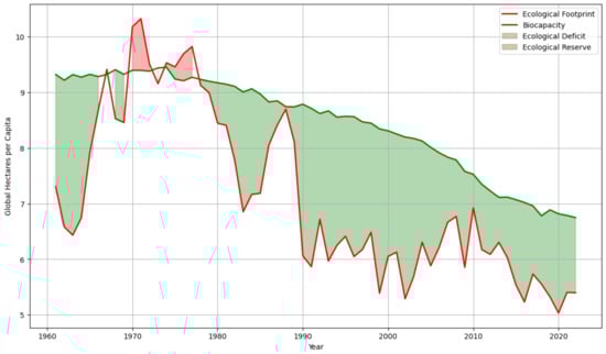 Evolution of Ecological Footprint, Biocapacity, and Ecological Deficit/Reserve for Norway (1961–2022). Source: Data from Global Footprint Network [1].