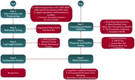 Figure 2 provides a step-by-step methodological flowchart for analyzing Norway’s ecological footprint (EF) using an Autoregressive Distributed Lag (ARDL) model. The flowchart begins with data collection and preprocessing, where variables related to EF, GDP, RENC, URB, and FDI are gathered and transformed. Stationarity testing is conducted to confirm that variables are suitable for the ARDL framework, followed by lag length selection using the Akaike Information Criteria. The next step involves cointegration analysis to establish long-term relationships between variables. Model estimation follows, with both long-run and short-run coefficients calculated to interpret the EKC and immediate impacts on EF. Diagnostic and stability testing ensures model robustness, while forecasting and model validation provide insights into the predictive power of the model for future EF trends. Each step is designed to systematically capture the complex relationships between economic variables and ecological impact, providing a comprehensive analysis of sustainability dynamics in Norway.