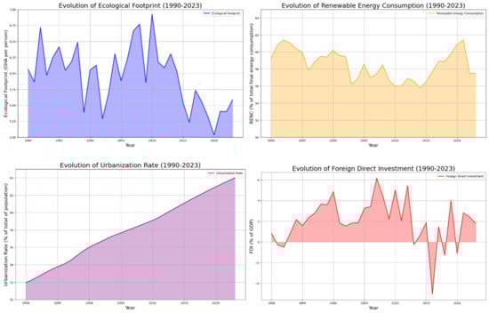This study examines the relationship between economic development, environmental sustainability, and various influencing factors in Norway over the period of 1990–2023. The variables selected for analysis provide a comprehensive view of both economic performance and ecological impacts, allowing for a nuanced understanding of the EKC hypothesis. Table 2 presents a detailed description of each variable, including the measurement units and data sources. The choice of variables is aimed at capturing the key determinants of environmental sustainability in the context of economic growth. The EF is used as the main indicator of environmental impact, measuring the demand placed on natural resources and the environment. The EF is the dependent variable, capturing the cumulative environmental impact of economic and social factors. The EF, measured in global hectares per person, reflects the demand on natural resources, making it a comprehensive measure of sustainability and environmental pressure. The GDP per capita serves as a proxy for economic development, adjusted for inflation to constant 2015 dollars to ensure comparability over time. In environmental studies, GDP is often included to explore the relationship between economic growth and environmental degradation, as it may reveal patterns consistent with the EKC [20,39]. Represented as a percentage of GDP, FDI captures the influence of international capital on the domestic economy. FDI can drive industrial expansion and potentially increase the ecological footprint due to higher resource use and emissions. Conversely, FDI can promote sustainability if it includes technology transfer or investments in environmentally friendly sectors. By measuring the percentage of energy from renewable sources, RENC provides insight into the shift towards sustainable energy, which can reduce EF. As renewable energy increases within the energy mix, it typically leads to a decrease in reliance on non-renewable sources, which are more polluting and resource intensive. Including RENC in the model helps capture this transition to cleaner energy, which can contribute to reducing EF in several ways. Renewable energy significantly lowers carbon dioxide emissions, one of the main drivers of ecological degradation. By reducing emissions associated with fossil fuels, higher RENC levels can help lessen the carbon component of EF. Renewable energy sources require fewer natural resource inputs over time, unlike fossil fuels, which involve continuous extraction, land disruption, and ecological harm. This shift supports sustainable resource management, thereby lowering overall environmental pressure. By increasing the share of renewable energy, countries align with sustainability goals aimed at reducing environmental degradation while meeting energy needs. The RENC serves as a metric to evaluate progress toward these objectives, showing whether a country is making strides toward a more sustainable energy profile that contributes to overall ecological balance. The URB, as the percentage of the total population in urban areas, typically intensifies resource demand and consumption. Its inclusion allows for analysis of how urban growth affects EF, particularly through concentrated infrastructure needs and lifestyle changes associated with urban living.