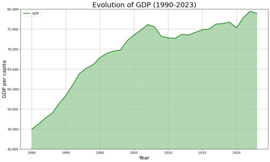 According to Figure 4, GDP increases steadily from around 50.000USD in 1990 to a peak near 80.000USD around 2008. This period of consistent growth suggests economic expansion, likely driven by Norway’s oil industry, high employment, and rising productivity. After 2008, GDP growth slows down, and there are some fluctuations. The dip around 2009 likely reflects the global financial crisis, which impacted economies worldwide. However, the recovery was relatively swift, with GDP stabilizing at a high level. From 2015 onward, GDP continues to rise, with small fluctuations but overall upward movement, reaching a new peak post-2020. The slight dip around 2020 could be attributed to the economic effects of the COVID-19 pandemic, but Norway’s economy appears to have rebounded quickly afterward.