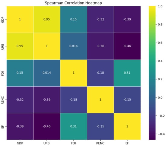 According to Figure 5, we can observe the strong positive correlation between GDP and URB, indicating that as economic growth occurs, URB also tends to increase. This suggests a close relationship between economic development and urban expansion, reflecting the concentration of economic activities in urban areas. The negative correlation between GDP and RENC indicates that higher GDP is associated with lower reliance on renewable energy sources. This trend could imply a preference for traditional energy sources as economies grow, potentially due to higher energy demands or less prioritization of green energy at certain development stages. Between URB and EF, we can observe the negative correlation indicating that despite increasing urbanization, the ecological footprint tends to decrease, potentially reflecting more efficient resource management and sustainable practices in urban areas. The positive correlation between FDI and EF implied that higher foreign direct investment is associated with an increase in the ecological footprint, possibly due to economic activities that intensify resource consumption or environmental pressures. The Pearson correlation results highlight stronger linear relationships between the variables, while Kendall’s correlation provides insights into general trends and ordinal associations.