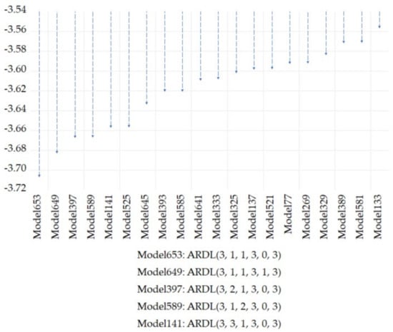To determine whether a long-term relationship exists among the variables, the ARDL cointegration bounds test is applied [44,45]. The null hypothesis of the test states that there is no cointegration, while the alternative hypothesis indicates that cointegration exists. If the calculated F-statistics exceeds the upper bound critical value, the null hypothesis is rejected, confirming the presence of a long-term equilibrium relationship.