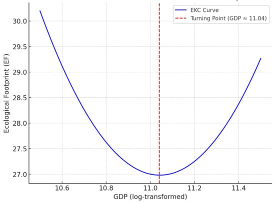The U-shaped EKC observed aligns with studies in other high-income countries, which also find that environmental impact decreases with economic growth up to a certain level, after which further growth increases environmental degradation. For instance, Pata and Aydin [21] and Wang et al. [22] reported similar EKC patterns in high-GDP countries, where increased income enables cleaner technologies and regulations that lower emissions initially. However, as GDP continues to rise, consumption-driven emissions offset these gains, supporting our results for Norway. Our findings also extend these insights by demonstrating that Norway’s EKC turning point appears later compared to studies on countries with less stringent environmental regulations, likely due to Norway’s focus on sustainable energy policies and high environmental standards.