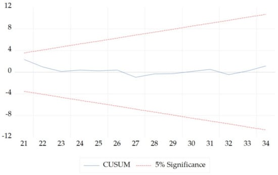 The model’s stability is evaluated using the CUSUM test, which indicates that the model parameters remain stable, as shown by the trajectory staying within the 5% significance level marked by a red dashed line in Figure 9.
