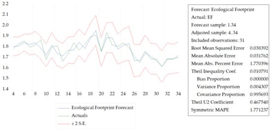 Figure 10 shows the forecasted evolution of the Ecological Footprint (EF) compared to the actual observed values, for a forecast sample ranging from 1 to 34, with an adjusted sample from 4 to 34, including 31 observations. The blue line represents the forecast for EF, while the green line indicates the actual values. The red dashed bands represent the standard error confidence intervals, showing the variability of the estimation. The error metrics indicate that the forecast is quite accurate. The Root Mean Squared Error (RMSE) is 0.038, and the Mean Absolute Error (MAE) is 0.032, reflecting small deviations between the forecasted and actual values. The Theil Inequality Coefficient of 0.010 suggests a good model fit, and the variance proportion is very low (0.004), indicating that most of the errors are due to covariance (99.6%). Additionally, the Symmetric MAPE value of 1.77% indicates high forecasting accuracy, while the Theil U2 coefficient below 0.5 suggests better performance than a simple extrapolation. Overall, the model used for forecasting EF shows a good ability to replicate the ecological footprint’s evolution within the given sample.
