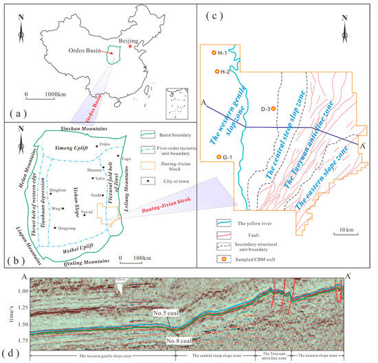 (a) The location of Ordos Basin in China; (b) a map illustrating the structural unit’s division of the Ordos Basin and the location of the Daning-Jixian block within the basin; (c) the major structures of Daning-Jixian block and the locations of sampled CBM wells; (d) EW seismic profile (A-A′ in (c)) of the Daning-Jixian block. Parts (c,d) were modified from Zhang et al. [41].