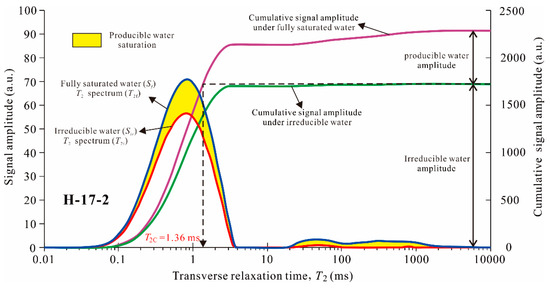 In the fully saturated spectra of coal, a critical T2 value, referred to as T2C, separates the spectra into two regions: producible and irreducible water [44]. Producible water, associated with T2 values greater than T2C, corresponds to seepage pores, where water can largely be drained, while irreducible water, linked to T2 values below T2C, indicates adsorption pores, where the drainage of water is hindered by capillary forces. Accurate determination of T2C is crucial for assessing the proportions of producible and irreducible water volumes, as well as the distribution of pore–fracture sizes.
