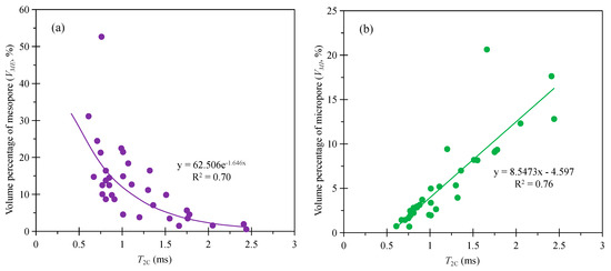 Plots showing T2C versus the volume percentage for mesopores (a) and micropores (b).