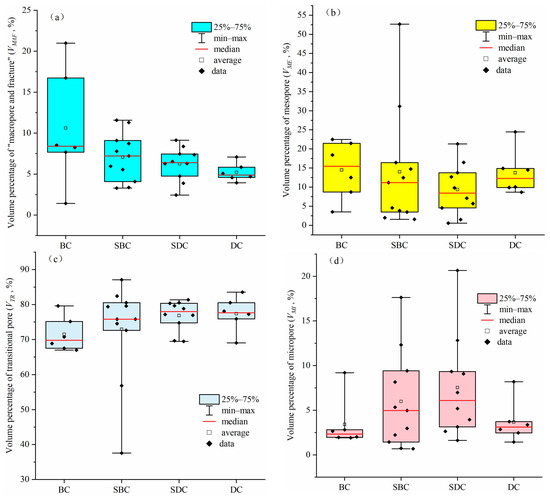 The volume percentages of “macropores and fractures” (a), mesopores (b), transitional pores (c), and micropores (d) in different macrolithotype coals.