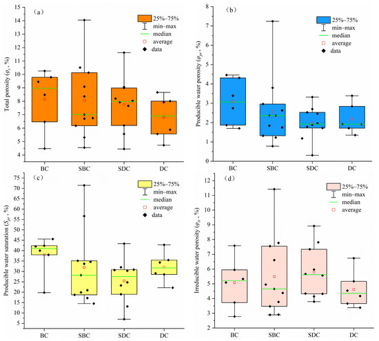 Influenced by differences in pore structure, the porosity characteristics of the deep coals sampled also vary across different macrolithotypes. Firstly, while the overall distribution of total porosity across different macrolithotype coals shows relatively small differences, the average total porosity follows a clear decreasing trend, starting with BC, followed by SBC, SDC, and finally DC (Figure 10a). Additionally, compared to SD and SDC, the BC and SBC exhibit overall higher average producible water porosity (φpr) (Figure 10b) and producible water saturation (Spr) (Figure 10c). This is because BC and SBC contain more “macropores and fractures” and mesopores, while both φpr and Spr show a high positive correlation with the total volumes of “macropores and fractures” and mesopores (Figure 11a,b). As for irreducible water porosity, the distribution differences across different macrolithotype coals are relatively small (Figure 10d).