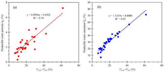Plots of “VMAF + VME” (total volumes of “macropores and fractures” and mesopores) versus φpr (a) and Spr (b).