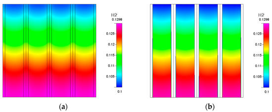 In addition to the hydrogen production trends, we can observe the distribution of oxygen and hydrogen in the fuel cell via the simulation results. After the RSOC reaction, the distribution of hydrogen and oxygen in the electrode and the flow channel is shown in Figure 5. It shows that regardless of whether the gas is hydrogen or oxygen, the region with a high concentration points to the downstream part. The gas generated by the reaction was forced from the upstream to the downstream section due to the influence of the flow channel. This results in the highest concentration being near the outlet.