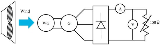 In Experiment 2, an experiment was conducted on the power generation characteristics owing to the difference in the installation angle and the position of the wind collector when using only the wind collector, when the number of blades of the small vertical-axis wind turbine was three and four, respectively, using the circuit configuration shown in Figure 7. As shown, the system comprised a wind collector, small wind power generator, rectifier circuit, and load resistor (150 Ω). Consequently, the power generated at the load end after passing through the rectifier circuit was measured.