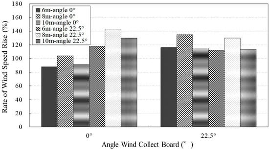 To confirm the fundamental characteristics of the wind collector alone, measurements were performed on the change in wind speed depending on the installation angle and position of the wind collector plate at constant wind speeds of 6, 8, and 10 m/s. The experimental results in Figure 8 show the rate of increase in wind speed achieved by installing a wind collector, relative to the wind speed input to the wind turbine. The calculations are based on considering the input wind speeds (6 m/s, 8 m/s, and 10 m/s) as 100%. As is evident, the introduction of the wind collector increased the wind speed on the rotation axis of the wind turbine. At wind speeds of 8 and 10 m/s, the introduction of the wind collector increased the wind speed by 130–140% compared with the wind turbine alone, thereby confirming the effectiveness of the wind collection effect.