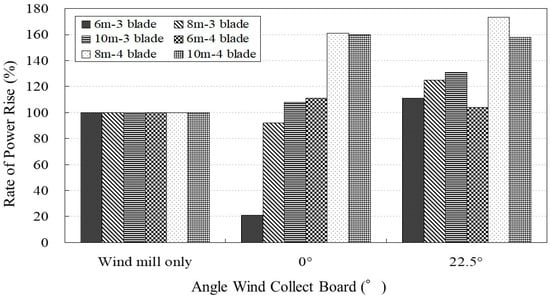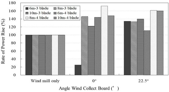 Power generation was measured by changing the installation angle and position of the wind collector plate when the wind speed was constant at 6, 8, and 10 m/s and a wind turbine was installed in the wind collector. The experimental results are shown in Figure 9 and Figure 10. Figure 9 and Figure 10 show the power generation characteristics based on the installation angle of the wind collector plate for each wind speed and number of blades when the wind collector positions were 0° and 22.5°, respectively. In addition, the rate of increase when the wind collector was installed for the case when the power generation of the wind turbine alone was set to 100% is depicted. As is evident, when the installation angle of the wind collector plate was 0°, the power generation reached 146% for the number of blades of three. Moreover, it increased to a maximum of 172% with four blades. In addition, when the number of blades was four, a stable rotation speed and stable power generation were realized at both installation angles of the wind collector plate of 0° and 22.5°.