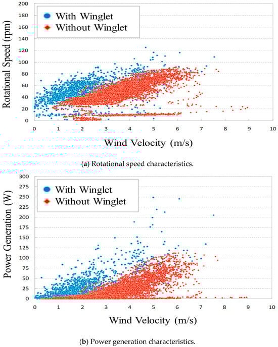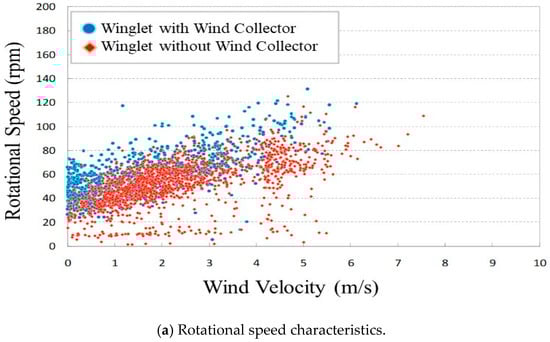 A similar comparison of Figure 13a,b shows that the introduction of the winglets facilitated increased rotation speed and power generation, even in low-wind-speed regions; however, the introduction of the wind collector yielded higher values overall. These field test results confirmed the effectiveness of introducing winglets and wind collectors.