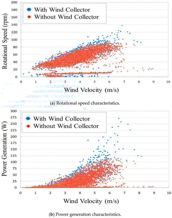A comparison of Figure 12a,b for the same wind speed range confirmed that the wind collector yielded higher values overall than the use of straight blades alone. Moreover, a high rate of increase was confirmed, particularly at high wind speeds.