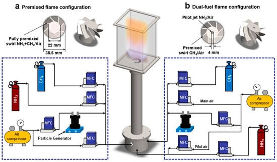System diagram of swirl combustion platform for (a) Premixed and (b) Dual flame configurations [].
