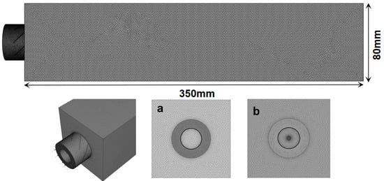 In this study, a three-dimensional model was developed using SolidWorks 2024 software, with the combustion chamber dimensions set at 80 × 80 × 350 mm. To ensure precise numerical simulations, the model was meshed using the Fluent Meshing tool within the ANSYS 2022 R2 platform. Subsequently, the numerical simulations were conducted using ANSYS Fluent 2022 R2, providing a robust computational framework for analyzing fluid dynamics and combustion phenomena with high accuracy. The schematic diagram of the grid division for the 3D model is shown in Figure 2.