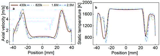 Comparison of (a) axial velocity and (b) static temperature profiles at a height of 20 mm for various grid densities.