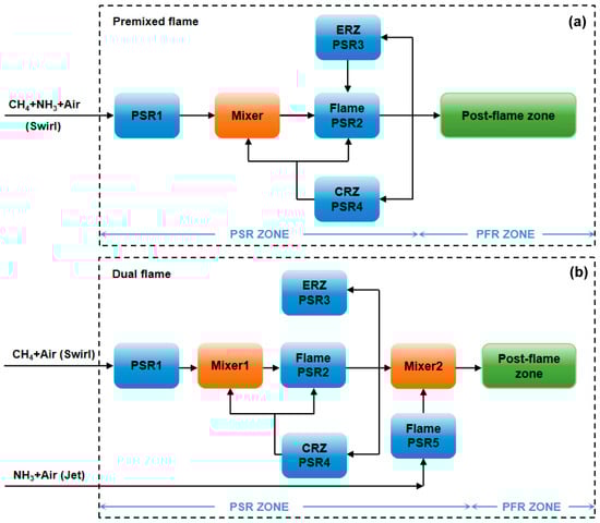 Schematic diagram of one-dimensional simulation of (a) premixed and (b) dual-fuel flames using a CRN model [].