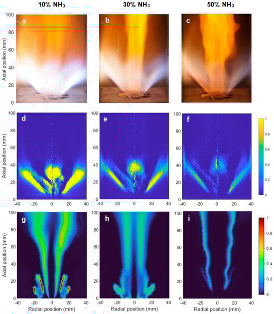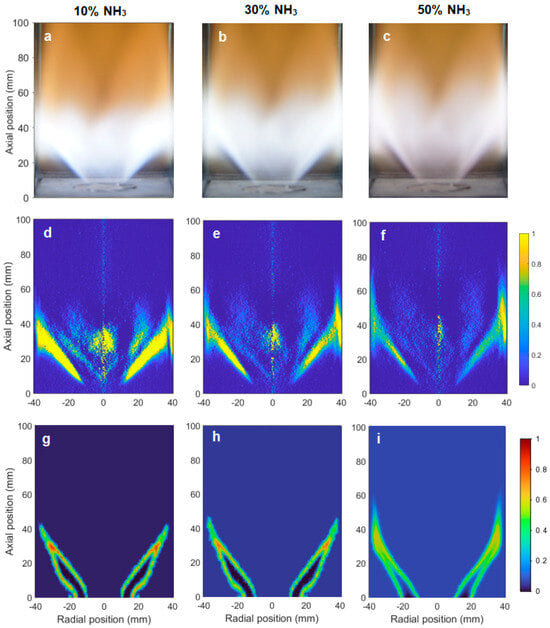 Premixed flame images (a–c) and OH* Abel inversion results (d–f) and CFD simulated OH mass fraction contour (g–i), ϕ = 0.7, with different NH3/CH4 vol.%.